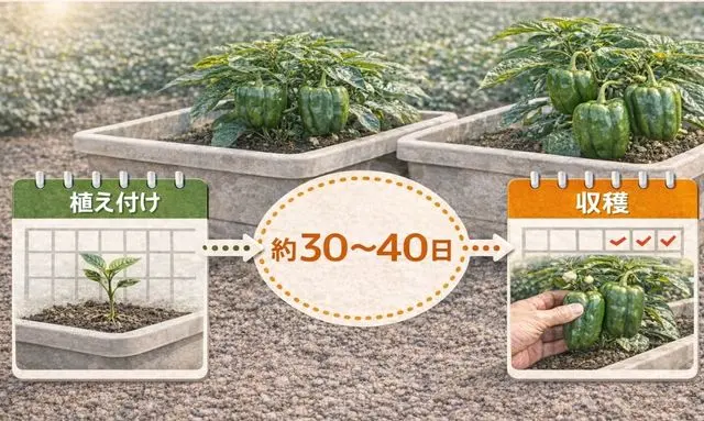 一般的に、苗から育てる場合のピーマンは、定植から約30〜40日ほどで最初の収穫を迎えることが多いとされています。ただし、この期間はあくまで目安であり、気温や日照、苗の状態によって前後します。定植直後の気温が低かったり、天候が不安定だったりすると、根の活着に時間がかかり、その分だけ収穫開始も遅れやすくなります。