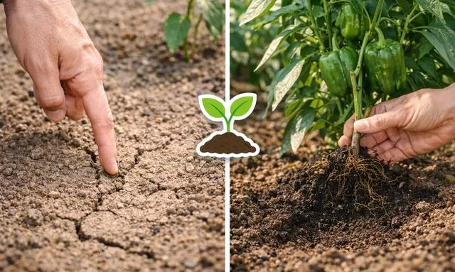 ピーマンの水やりでは、「乾いたかどうか」ではなく、**「どの深さまで乾いているか」**を見ることが重要です。指を土に差し込んだり、鉢を持ち上げて重さを確認したりすることで、土の中の水分状態を把握しやすくなります。表面だけでなく、根が張っている層まで乾き始めているかどうかを確認することで、根が本当に水を必要としているタイミングを見極めやすくなります。