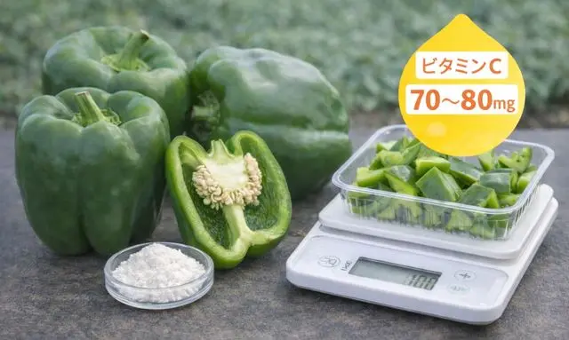 一般的に、緑ピーマン100gあたりにはおよそ70〜80mg前後のビタミンCが含まれているとされています。これは日常的な食事の中でも比較的多い部類に入り、野菜の中でもトップクラスの水準です。赤ピーマンになるとさらに含有量が増え、100gあたり150mg前後になることもあります。色が変わることで栄養価も変化する点は、ピーマンの興味深い特徴のひとつです。