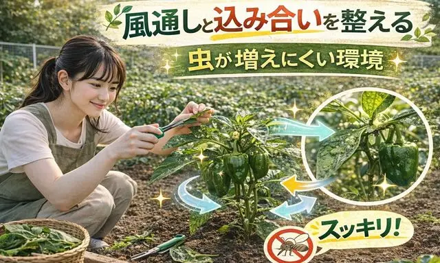 ピーマン栽培では、害虫対策というと薬剤や防虫ネットに意識が向きやすいですが、実はそれ以上に重要なのが「虫が増えにくい環境を作ること」です。家庭菜園では完全に虫を防ぐことは難しいため、発生してから対処するよりも、最初から増えにくい状態を保つことが安定した栽培につながります。その基本となるのが、風通しを良くし、株の込み合いを整えることです。