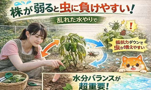 ピーマンの害虫トラブルは、「虫そのもの」だけが原因とは限りません。実際には、株の体力が弱っているときほど虫の被害が広がりやすくなる傾向があります。その中でも大きく影響するのが、水やりの乱れです。水不足だけでなく、過湿や乾燥の繰り返しなど、バランスの崩れが株の抵抗力を下げ、虫に負けやすい状態を作ってしまうことがあります。