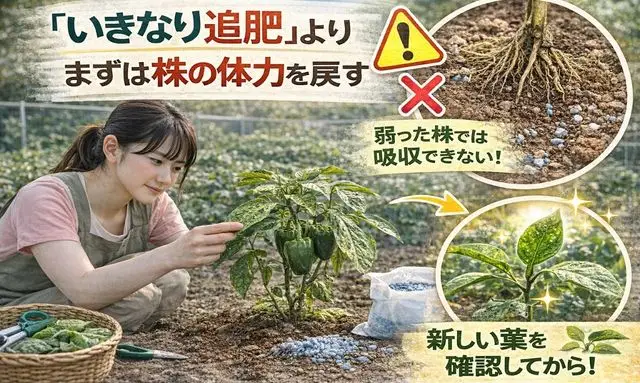 追肥は、株が回復の兆しを見せてから行うことで効果が高まります。新しい葉がしっかり展開し始めたタイミングで少量ずつ追加することで、過剰な負担を避けながら生育を安定させることができます。この段階で適切に肥料を補うことで、花付きや実の成長も改善しやすくなります。