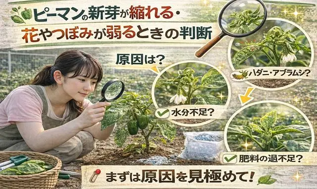そこで本記事は、害虫の種類を細かく暗記するための記事ではありません。ピーマン栽培で実際に多いケースに絞って、「いま何を優先すべきか」が迷わず決まるように、判断基準と対応の順番をまとめます。