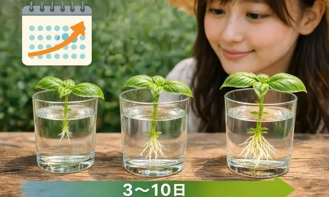 このように、バジルの挿し木は比較的短い期間で根が出ることが多く、家庭菜園初心者でも成功しやすい増やし方です。 暖かい環境で管理しながら様子を見守ることで、新しい根が伸びていく様子を観察できるでしょう🌱