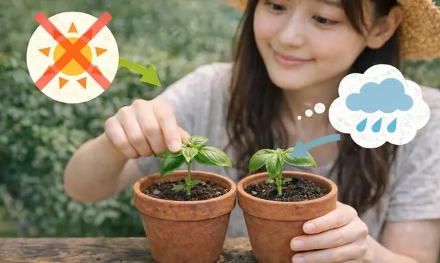 まず意識したいのは強い直射日光を避けることです。 バジルは日当たりを好む植物ですが、挿し木直後の枝は水分を吸い上げる力がまだ弱いため、強い日差しを受けると葉から水分が蒸発しやすくなり、しおれてしまうことがあります。 そのため、挿し木後は明るい日陰や半日陰の場所で管理すると、枝への負担を減らすことができます。