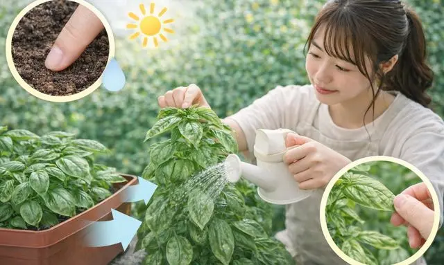 このように、水やりと株の健康管理は害虫対策にも深く関係しています🌱 日頃からバジルの葉の状態や土の乾き具合を確認しながら管理していくことで、害虫の被害を抑えながら家庭菜園を楽しむことができます。基本的な管理を続けることが、健康なバジルを育てる一番のポイントになります。