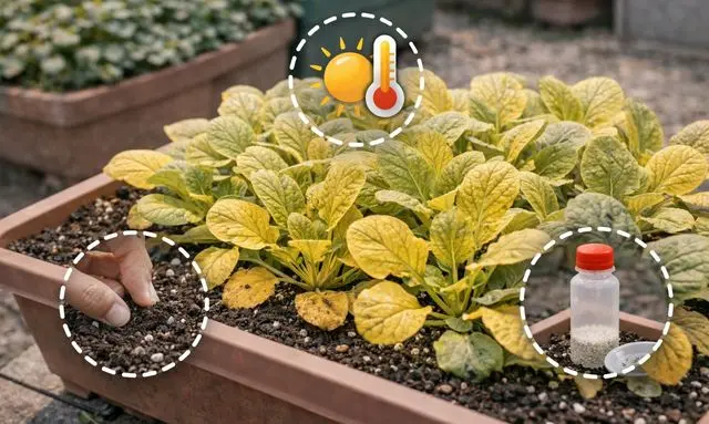 小松菜の黄色化に気づいたら、下葉か全体か、水やり、日当たり、込み具合、時期を順番に見直すと原因を整理しやすいです。