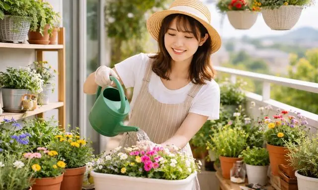 庭がない住まいでも玄関先や小スペースでガーデニングを楽しむ20歳の日本人女性