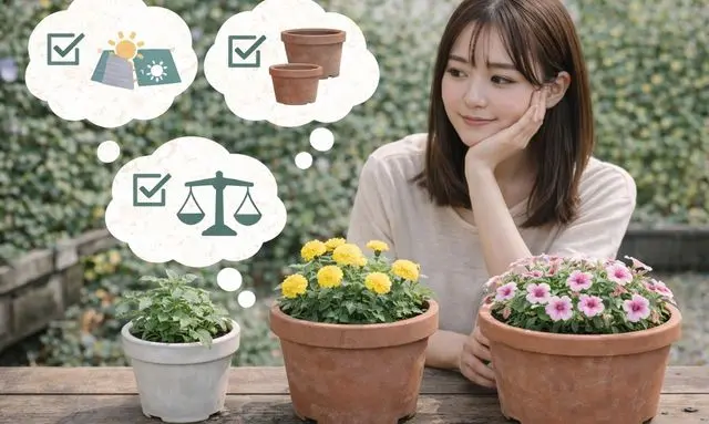 鉢選びは経験とともに感覚も分かってきます。最初はこのようなチェックポイントを参考にしながら、無理なく管理できるサイズを選ぶことが、長く楽しく育てるコツになります 🌼
