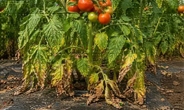 立ち枯れでしおれて枯れたトマトの株と健康な株の違いが分かる画像