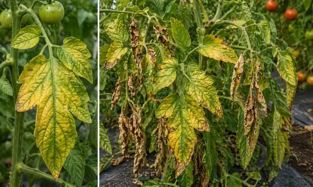 トマトの病気による葉の斑点・枯れ・実の腐敗などの症状を比較した画像