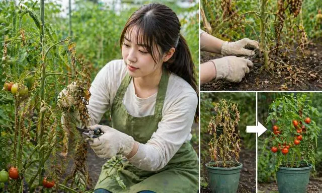 枯れかけたトマトの株を確認する女性と復活後の元気な株の変化が分かる画像